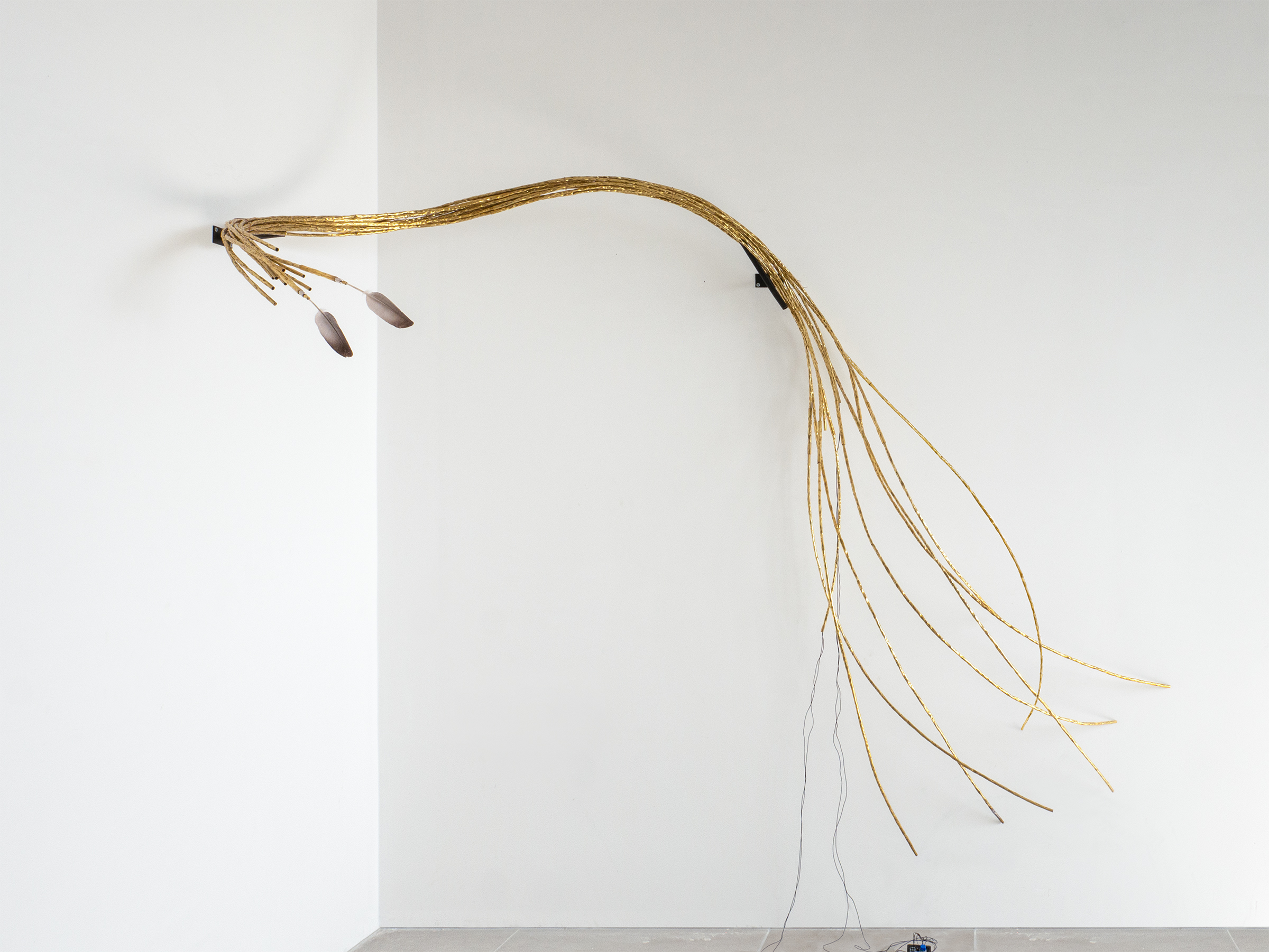 2024, Motors activated by a recorded conversation, feathers, brass, audio player, cables, 170x120x170 cm